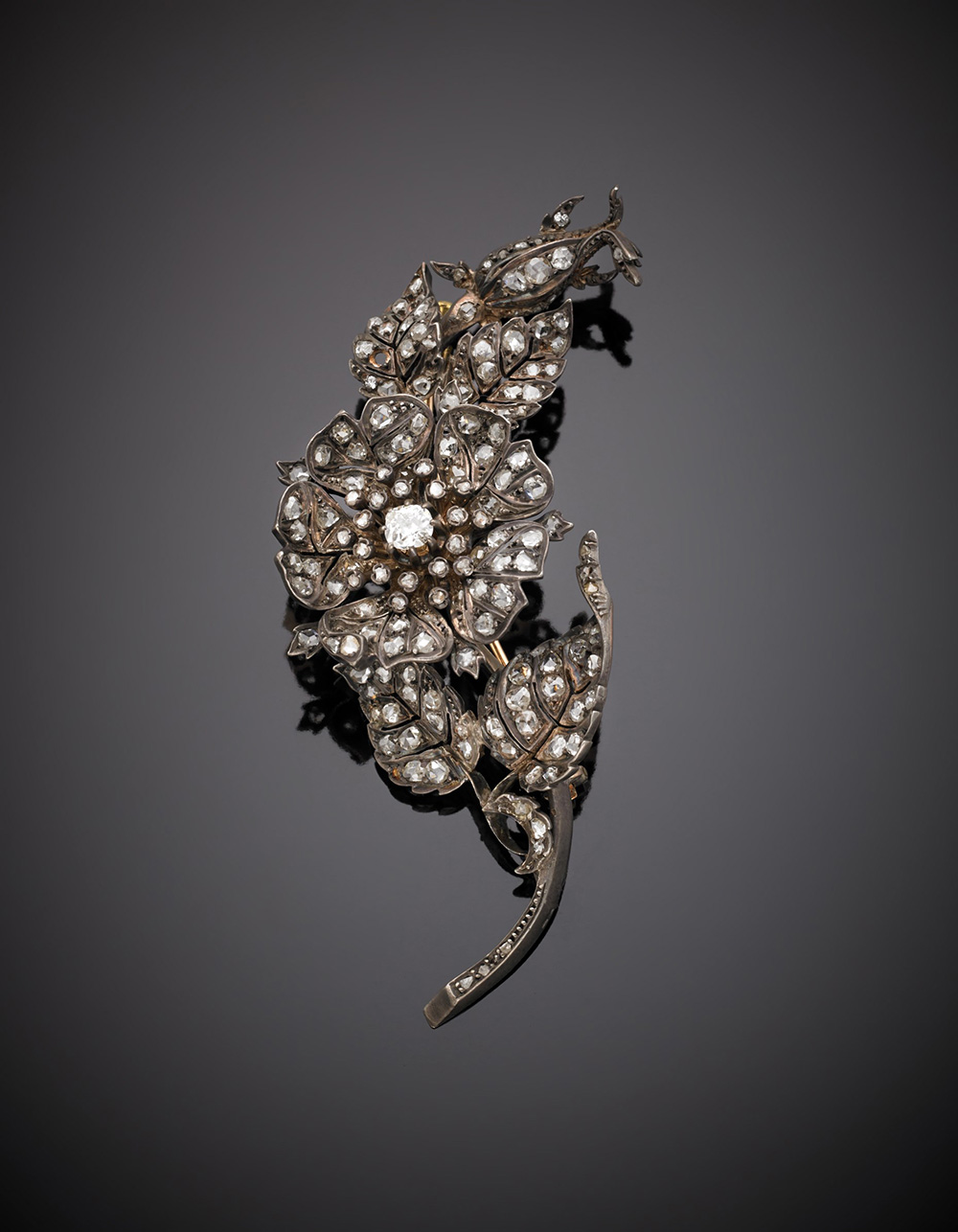 Broche a guisa di ramo floreale in oro rosso 333/1000 , argento e diamanti,...