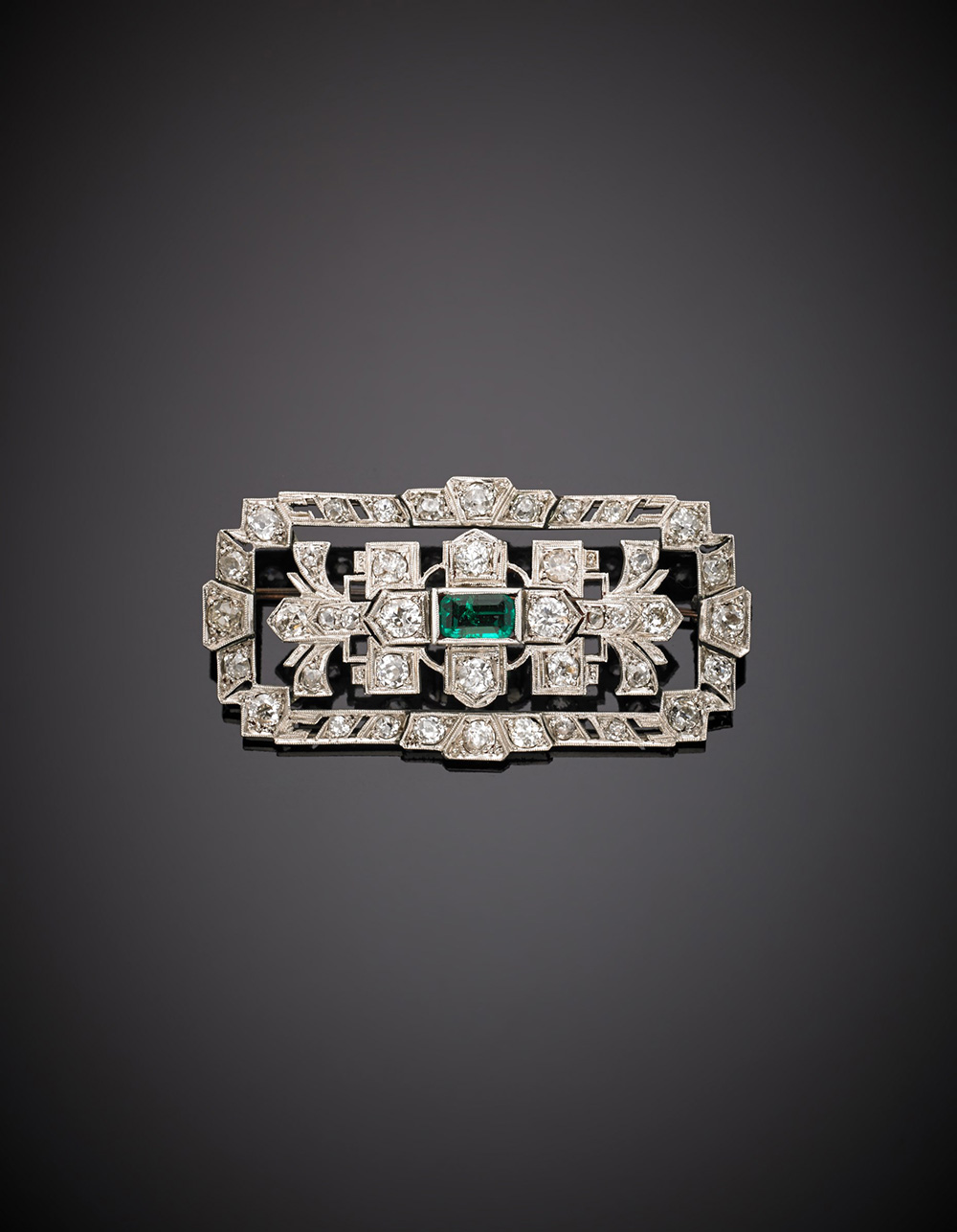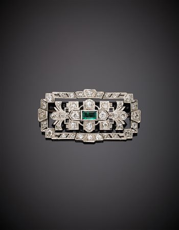 Spilla in platino con diamanti rotondi ed al centro uno smeraldo ovale montato su rettangolo, g. 11,60, largh. cm 5 circa A rectangular platinum and diamond brooch centered by an oval emerald g.11,60, width cm 5