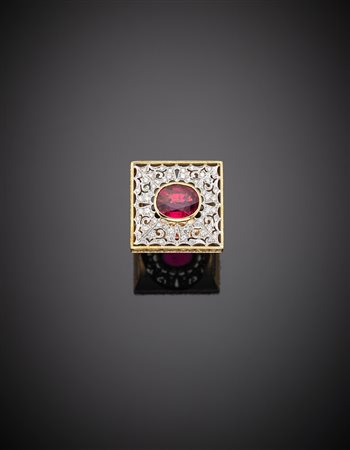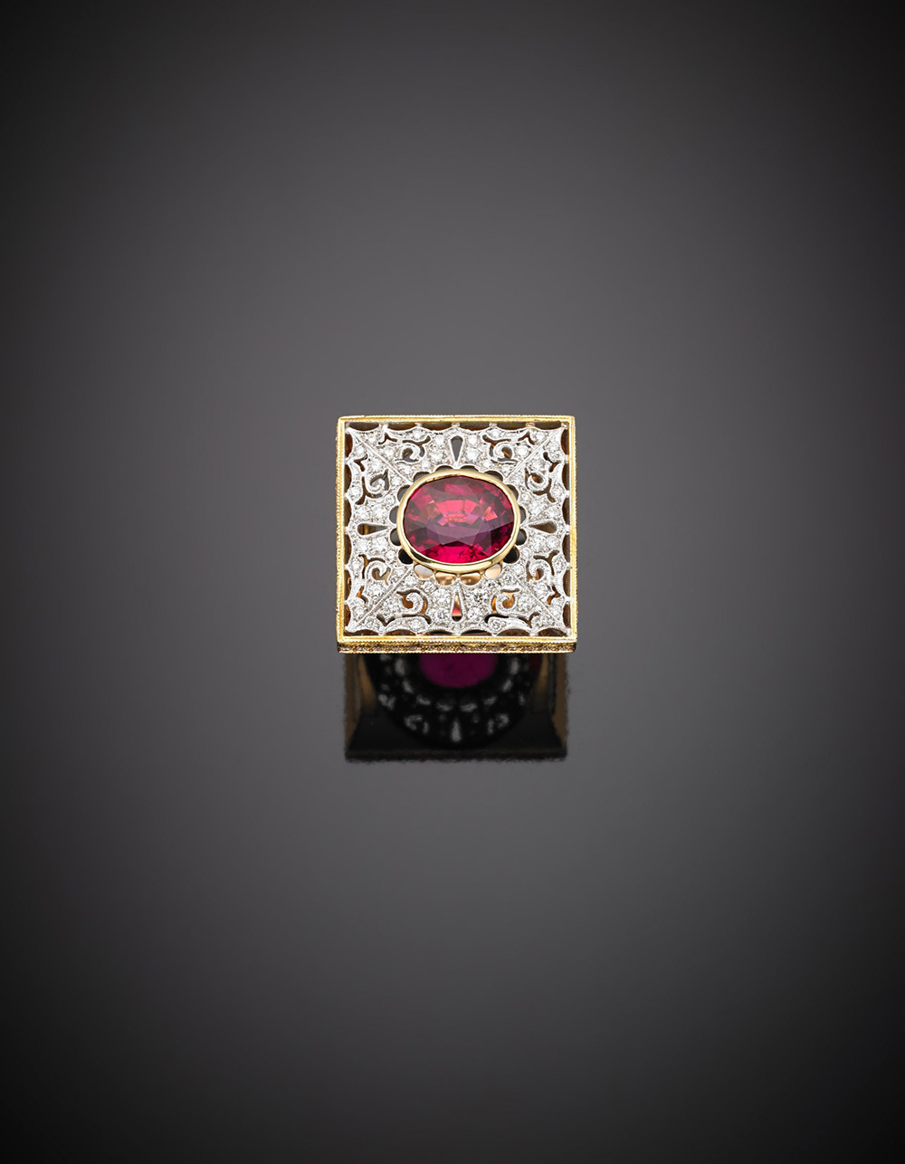 CAZZANIGA Anello quadrato in oro bianco, giallo e rosa, cesellato e traforato con rubellite ovale di ct.3,30 circa e rifinito in diamanti , g. 23,30 misura 16/56 CAZZANIGA Tri-coloured chiselled openwork gold diamond and a ct.3,30 rubellite square ring, g. 23,30 size 16/56