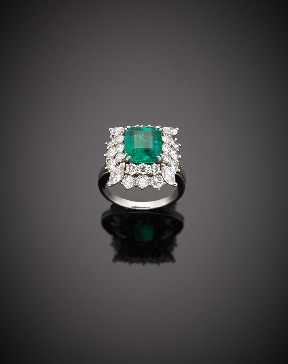 Anello in oro bianco con diamanti rotondi e a navette a contornare uno smeraldo ottagonale di ct. 2,80 circa, g. 10,80, misura 12/52 White gold and diamond ring with octagonal emerald of ct. 2,80 c., g.10,80 size 12/52