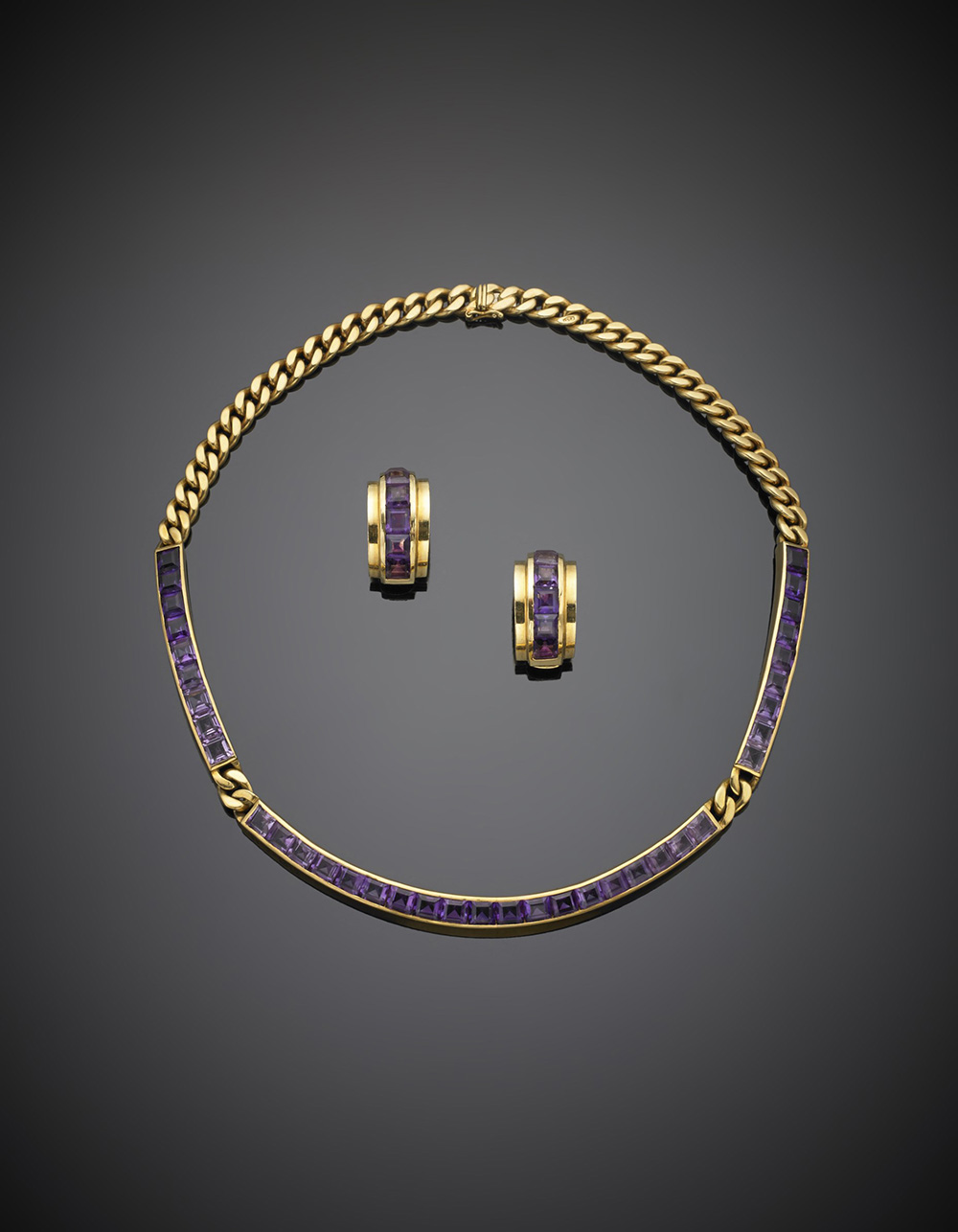 CARDI MILANO Demi-parure composta da orecchini a lobo e collier semirigido tutto in oro giallo con ametiste carrè, g. 61,20, collier lungh. cm 35,50 circa CARDI MILANO Yellow gold set comprising two earclips and necklace with calibré amethyst, g. 61,20 length cm 35,50 c.