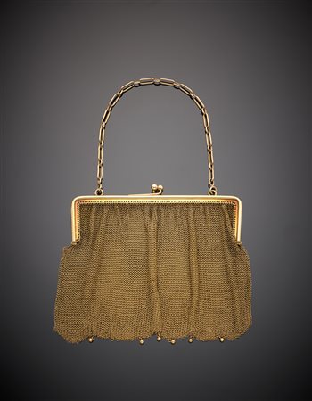 Borsina in oro giallo con manico a catena e piccola frangia di boules d'oro, marcato con testa d'aquila g.164,50 Yellow gold chain handle mesh bag and small gold bead fringe, g.164,50. "Eagle head" mark
