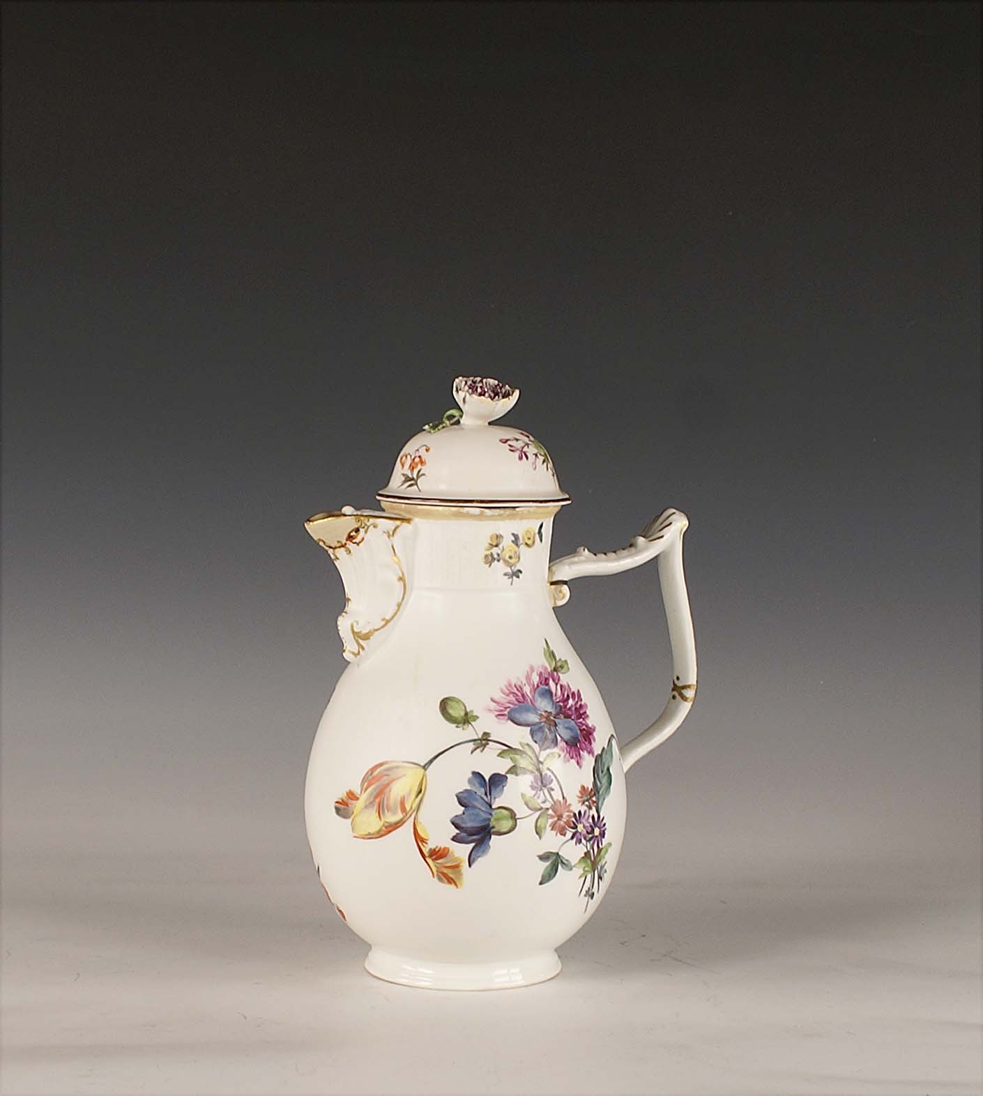Caffettiera in porcellana dipinta a policromia e decorata a motivo floreale, Meissen, vecchia manifattura, h. cm. 23, (lievi difetti).