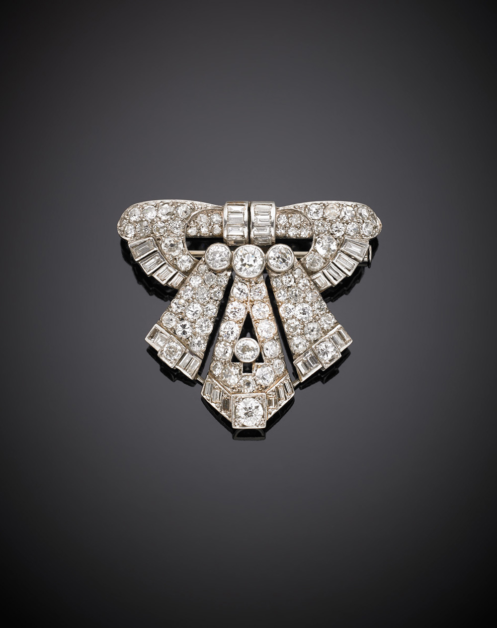 Spilla in platino a guisa di ventaglio con diamanti rotondi e baguette g....