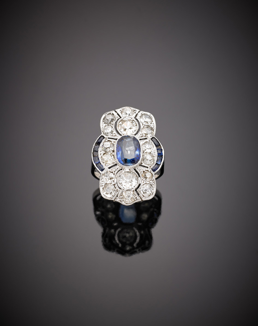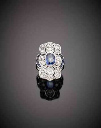 Anello in platino con diamanti rotondi e zaffiro ovale di ct.1,20 circa e altri carrè, g. 4,90, misura 6/46 (mancanze) Platinum diamond ring with ct.1,20 oval and tapered sapphires, g.4,90 size 6/46 (losses)