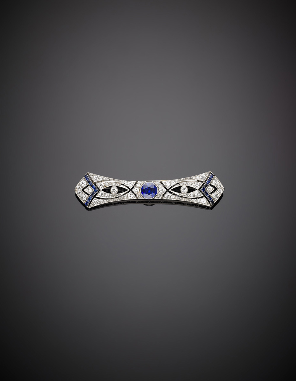CARTIER NEW YORK Spilla in platino con diamanti e zaffiri tapered e rotondo...