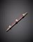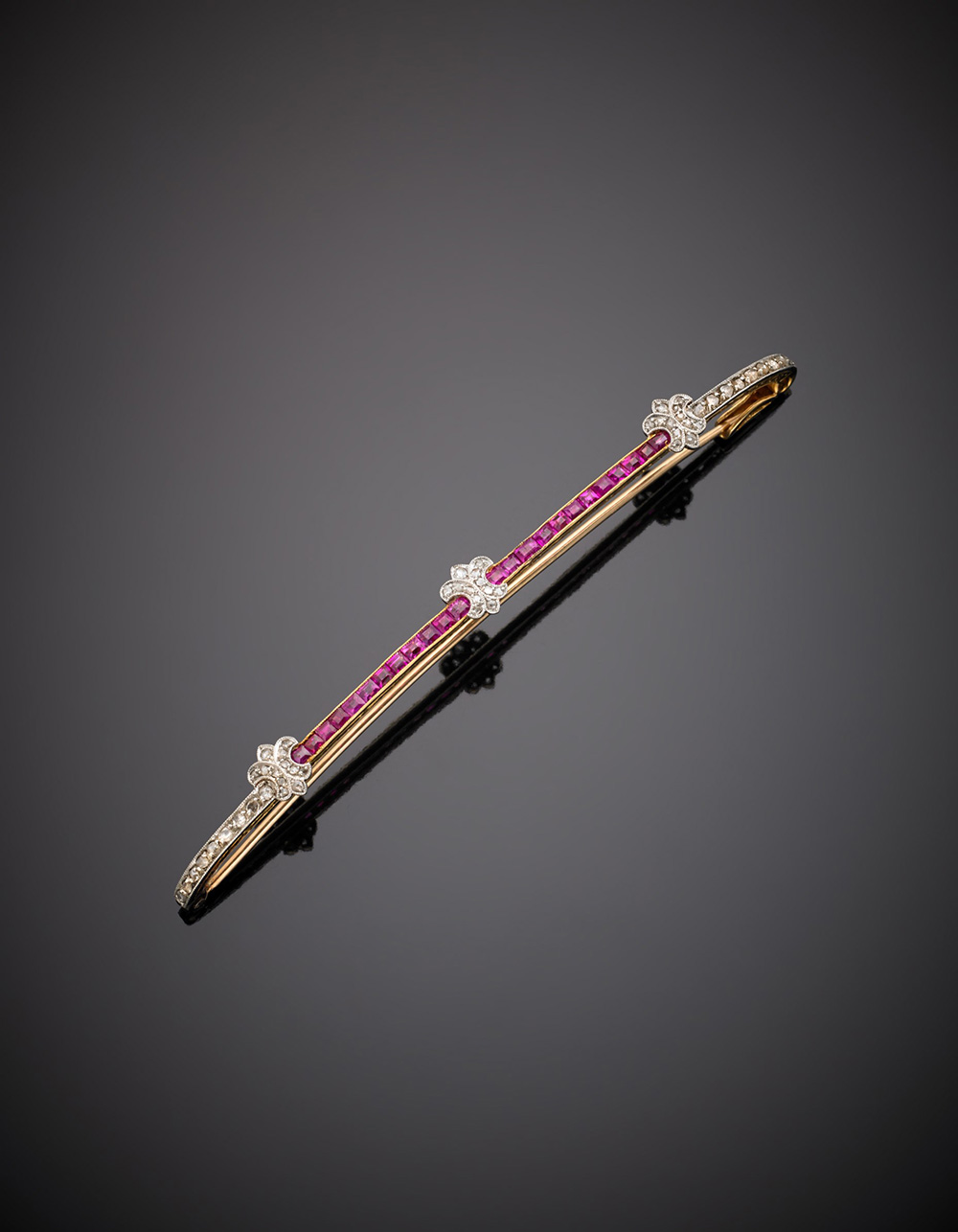 Spilla in oro giallo e bianco, cesellato, a barretta con piccoli gigli con diamanti e rubini, g.8,30 lungh, cm 9,3 circa Bi-coloured chiselled gold diamond and ruby fleur-de-lis bar brooch, g.8,30 length cm 9,3 circa
