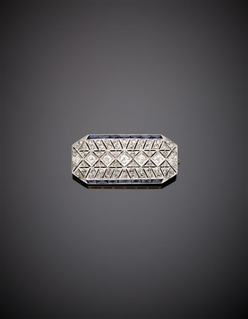 Broche in oro giallo e platino con diamanti rotondi e zaffiri, g.11,70 lungh. cm 4,50 Platinum and yellow gold diamond and sapphire brooch, g.11,70 length cm 4,50