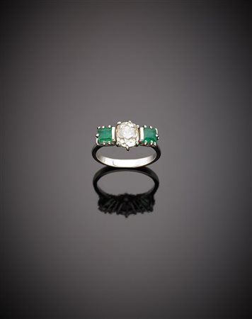 Anello in oro bianco con diamante centrale taglio a cuscino di ct.1,35 circa affiancato da due smeraldi carré, g.3,80 misura 14/54 White gold central cushion cut ct.1,35 diamond ring with carré emerald shoulders, g.3,80 size 14/54