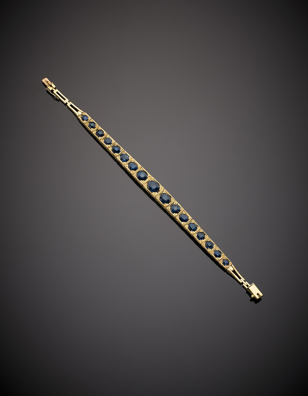 Bracciale in oro giallo con lavorazione barocca sui lati e rifinito con zaffiri ovali a scalare, due maglie per allungarlo, g. 19,90, lungh. cm 16. Prov.: Eredi Principessa Petronilla Costanza Poniatowsky, figlia dell'ultimo re di Polonia Yellow gold baroque inlay graduated oval sapphire modular bracelet, two spare segments, g.19,90 length cm16 Once property of the Princess Petronilla Costanza Poniatowsky, last daughter of the King of Poland