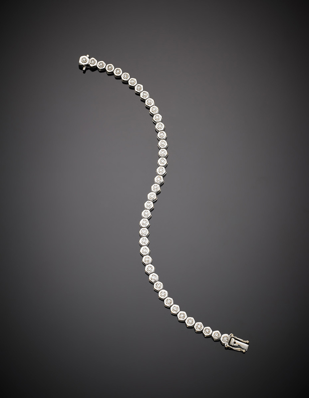 Bracciale tennis in oro bianco e diamanti rotondi, g. 16,60, lungh. cm 18,5 White gold round diamond bracelet, g.16,60 length cm 18,5