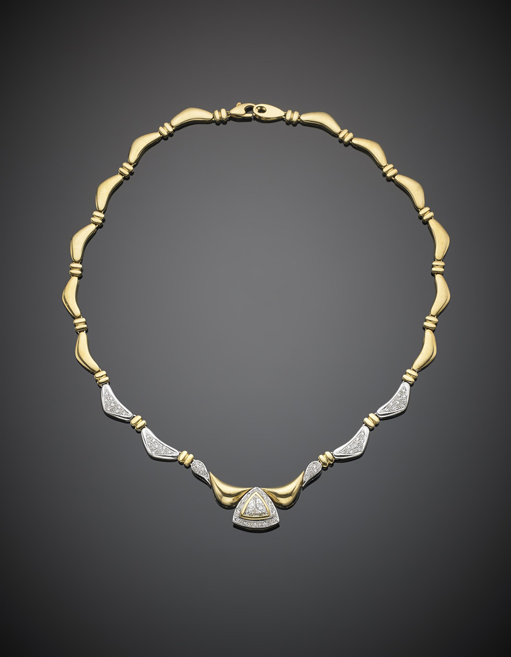 Collier in oro giallo e bianco diamante centrale triangolare di ct. 1,00 circa e rifinito con altri diamnti a pavè, g.36,20, lungh. cm 40,50 circa Bi-coloured gold necklace with diamond pavé segments and a central triangular diamond weighing ct. 1,00 circa, g.36,20 length cm 40,50 circa