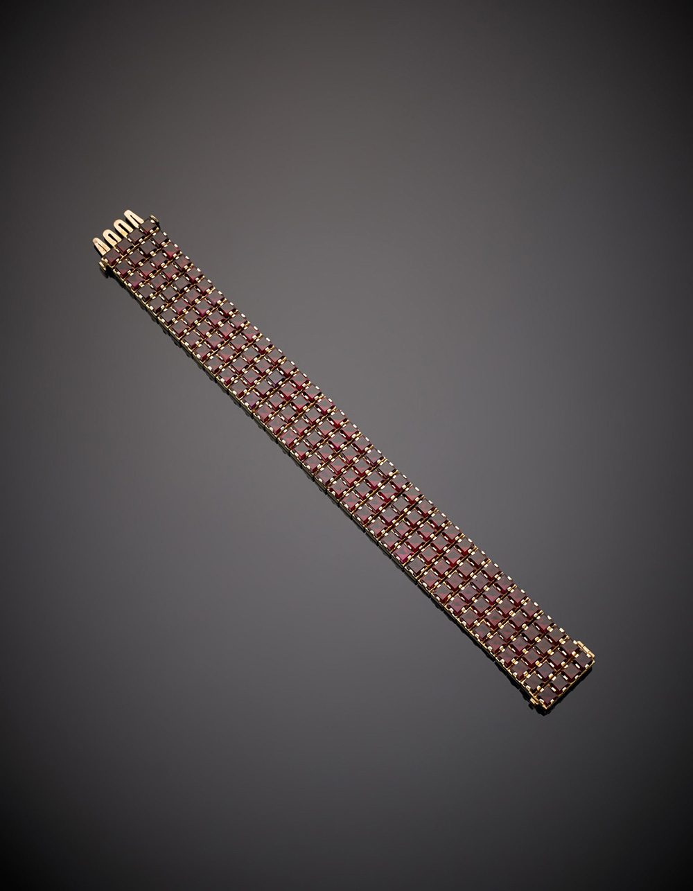 TIFFANY&CO Bracciale in oro giallo 585/1000 con pavé di granati a carré, g. 73,20, lungh. cm 18 circa TIFFANY&CO 14K yellow gold flexible band bracelet with carré garnet pavé g. 73,20, length. cm 18 circa