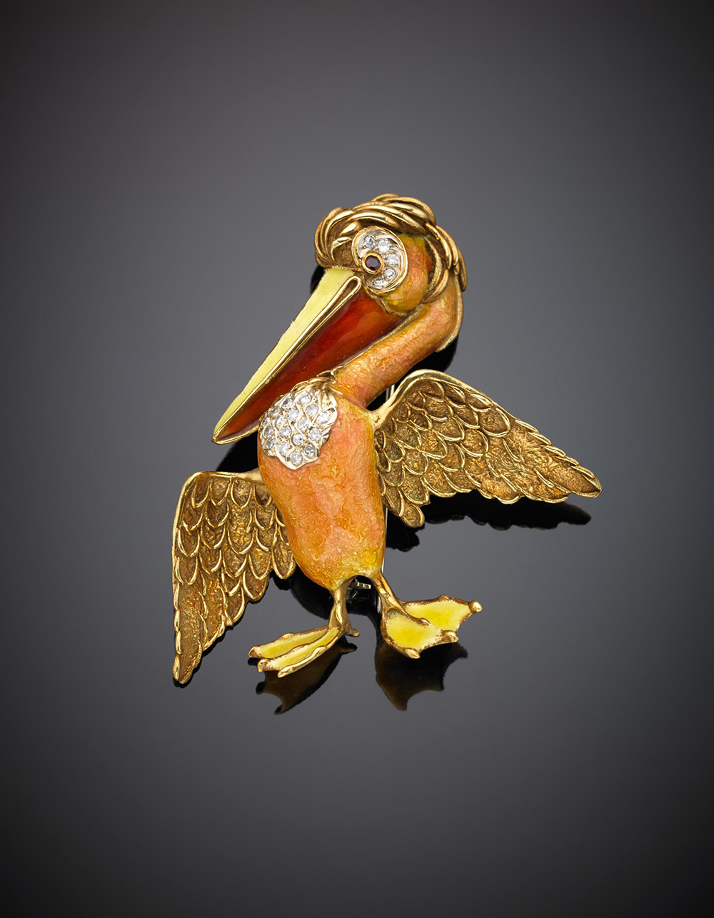 FRASCAROLO Broche a guisa di pellicano in oro giallo con smalti dal giallo...
