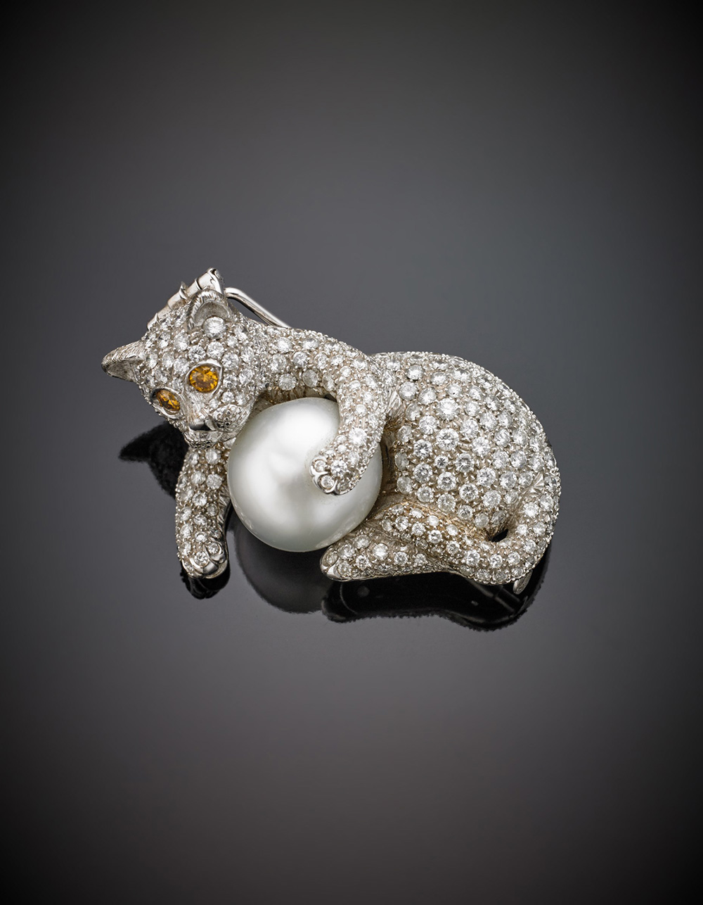 MISSIAGLIA Broche a guisa di gatto in oro bianco con diamanti di cui due fancy-yellow agli occhi e perla South-sea bianca con sfumatura grigia di mm 14,50 circa, g.24,10, lungh. cm 4,2 circa MISSIAGLIA White gold diamond cat brooch with fancy yellow eyes and a grayish white south sea pearl of mm 14,50 g.24,10 length cm 4,2 circa