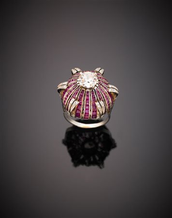 Platinum diamond and ruby dome shaped ring, central diamond, ruby in all ct.3,60 circa, g. 8,60 size 10,50/50,50