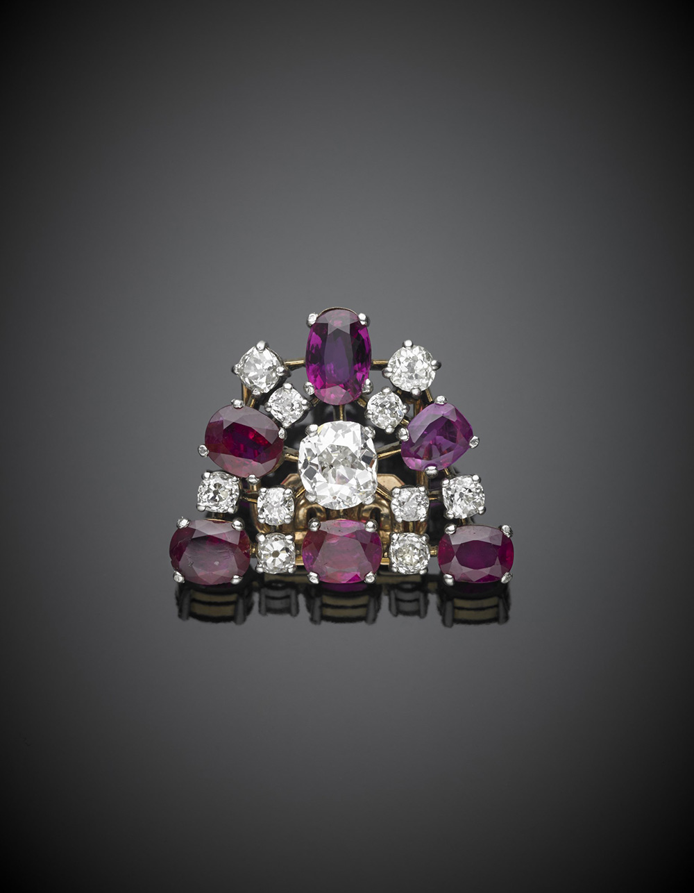 BULGARI Spilla in oro giallo e bianco con diamanti rotondi e rubini ovali a contornare un diamante taglio cuscino di ct. 1,70 circa, rubini per complessivi ct.7,50 diamanti per complessivi ct.3,50 g. 13,40 Accompagnato da analisi gemmologica del CISGEM n. 5185 del 23/01/2017, Milano BULGARI Bi-coloured gold round diamond, oval ruby brooch with central cushion cut diamond of ct, 1,70 circa, diamond in all ct.3,50 ruby in all ct.7,50, g.13,40 Appended CISGEM jewellery certificate