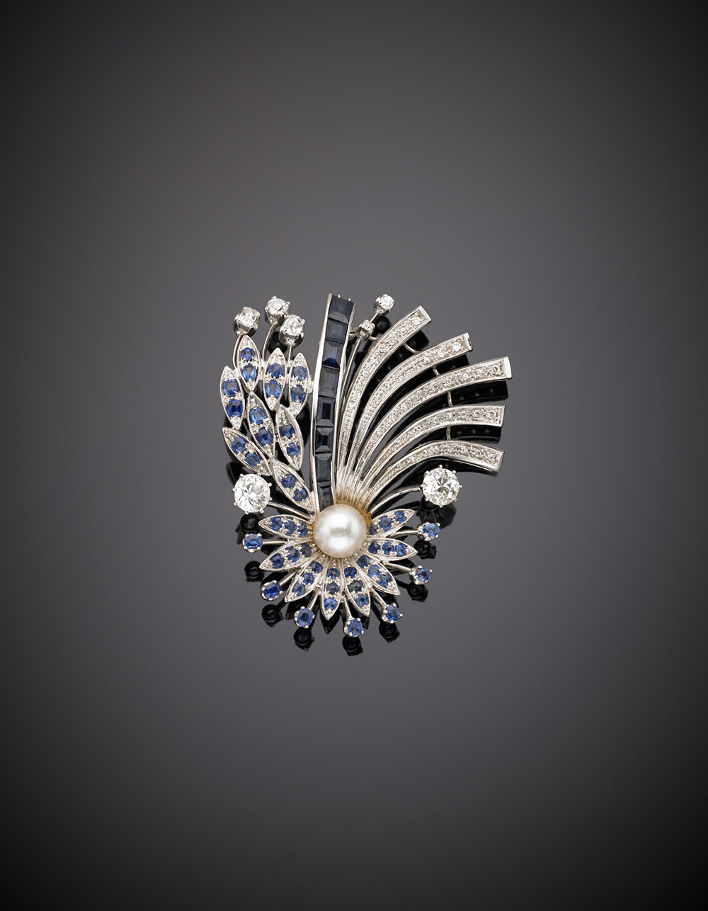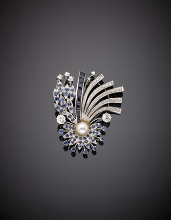 Broche in oro bianco, diamanti, zaffiri e perla centrale a guisa di fiore con...