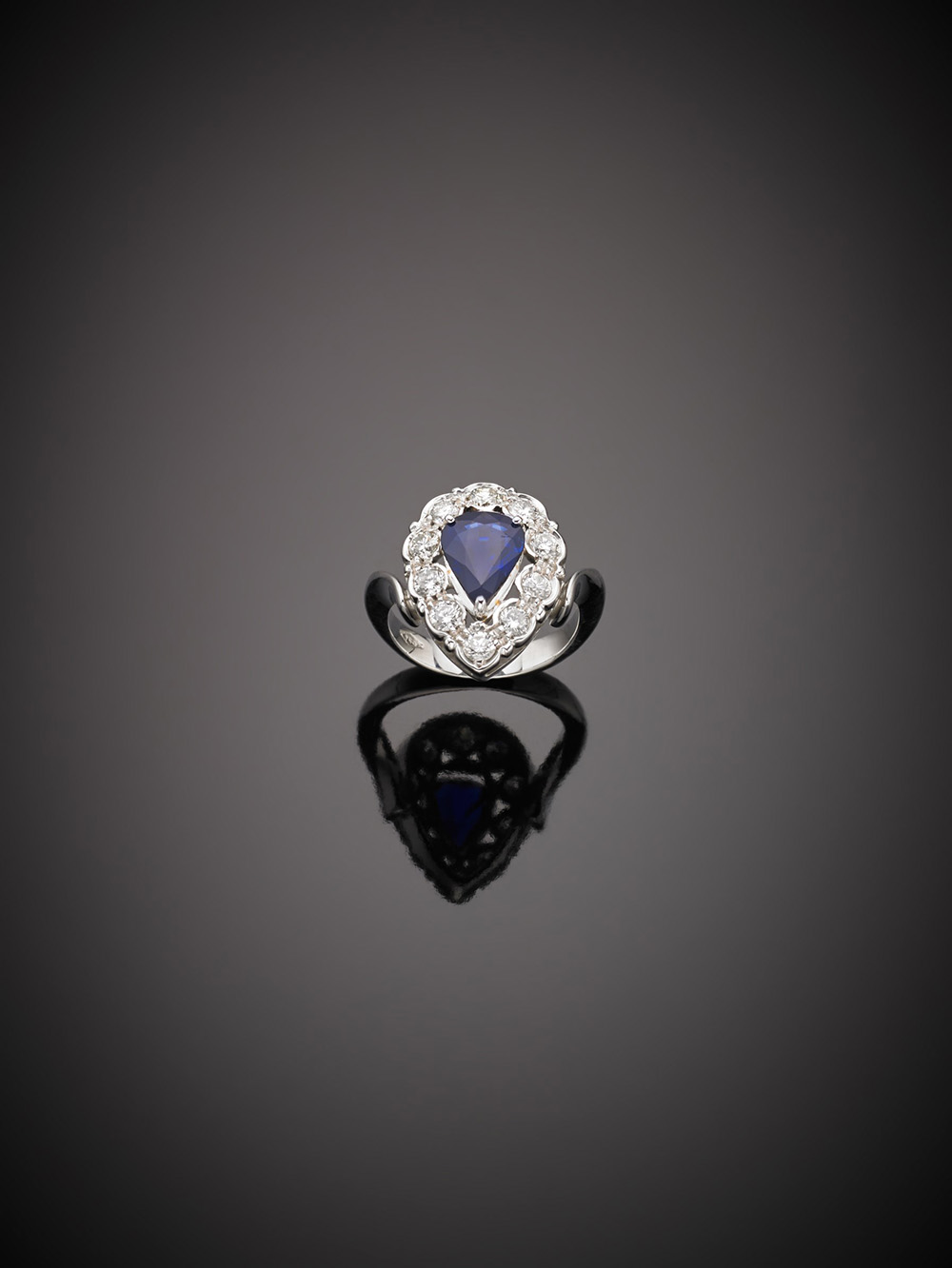 Anello in oro bianco con al centro uno zaffiro a goccia di ct.1,50 circa e contornato da diamanti, g.6,60 misura 11/51 White gold diamond and ct.1,50 pear shaped sapphire ring, g.6,60 size 11/51