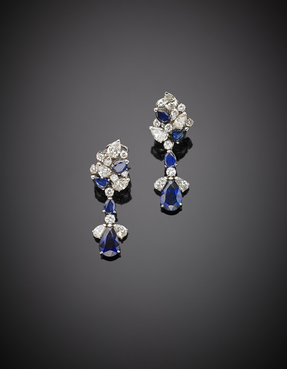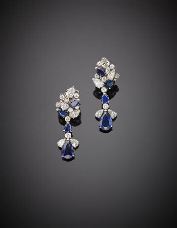 CHANTECLER Orecchini pendenti in oro bianco con diamanti, per complessivi ct.5,90 circa, e zaffiri, per complessivi ct.11 circa, a goccia e rotondi g.15,90 lungh. cm 4,2 circa , firmati Chantecler Capri sulla chiusura, in scatola originale CHANTECLER White gold diamond sapphire drop pendant earrings g.15,90 length. cm 4,2 circa ,in all diamond ct.5,90 and sapphire ct.11 circa, signed Chantecler Capri on the clasp, in original box
