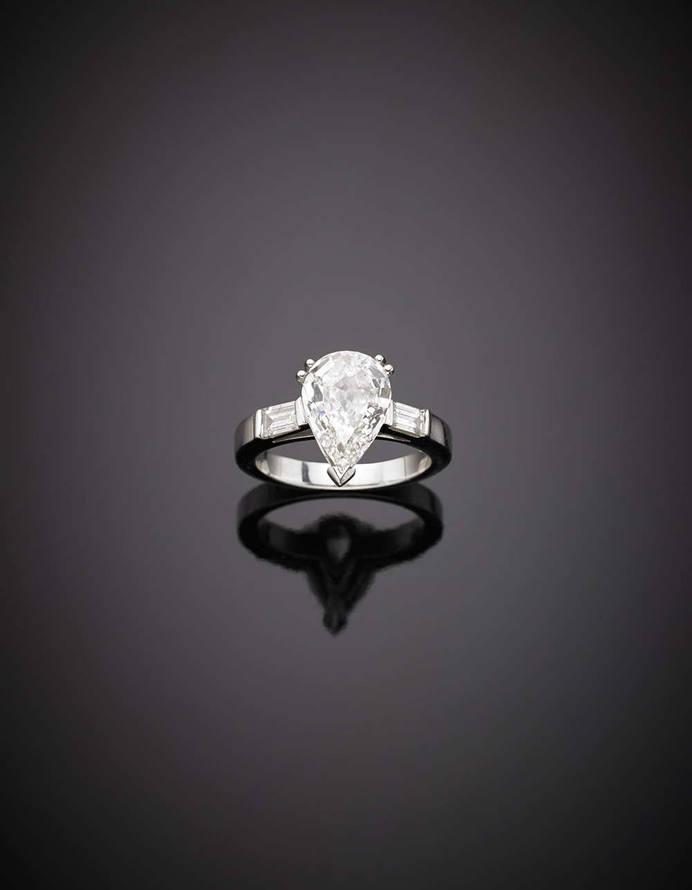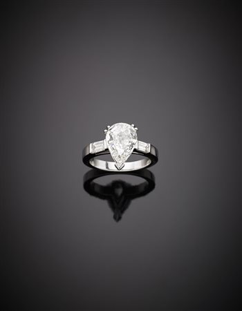 Anello in oro bianco con diamante a goccia di ct 3, e due piccole baguette,...