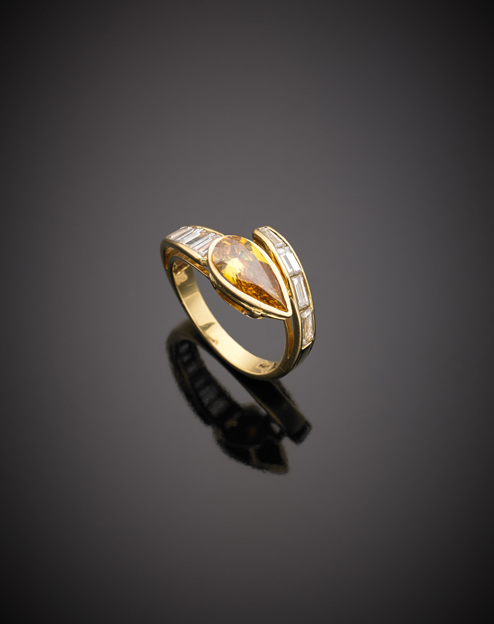 Anello in oro giallo a guisa di serpente con diamante fancy vivid yellow a goccia di ct.1,16 e diamanti baguette sulla coda, g.4,70 misura 13/53 Accompagnato da Certificato Gemmologico n.5420IAABIB del CISGEM Milano, 09/02/2017 Yellow gold diamond snake ring with a ct.1,16 fancy vivid yellow diamond, g.4,70 size 13/53 Appended Diamond Report n.5420IAABIB, CISGEM Milano, 09/02/2017