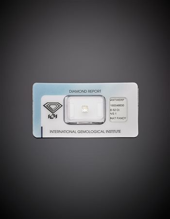Diamante di forma ottagonale taglio a brillante modificato fancy yellow ct 0,52. In blister Accompagnato da certificato gemmologico IGI n. 185546630 del 26/11/2015 Anversa, Belgio Octagonal modified brilliant cut fancy yellow ct.0,52 diamond. In blister Appended Jewellery Certificate IGI n. 185546630 26/11/2015 Antwerp, Belgium