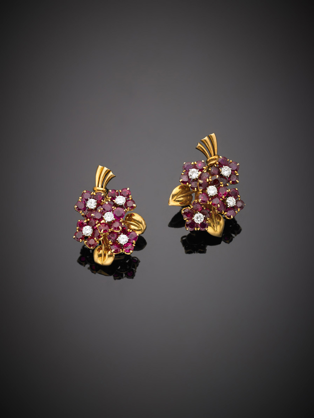 VAN CLEEF & ARPELS Orecchini in oro giallo a formare due bouquet con rubini per complessivi ct.7,50 circa, a contornare diamanti rotondi per complessivi ct.1,50 circa, g. 21,20, h cm 3 circa. Punzoni n. 65637, 65637 e testa d'aquila. In custodia VAN CLEEF & ARPELS Yellow gold diamond and ruby bouquet earrings, ruby in all ct.7,50 circa and diamond in all ct.1,50 circa g.21,20 h cm 3 circa. French hallmarks: "eagle head", 65637, 65637. With case