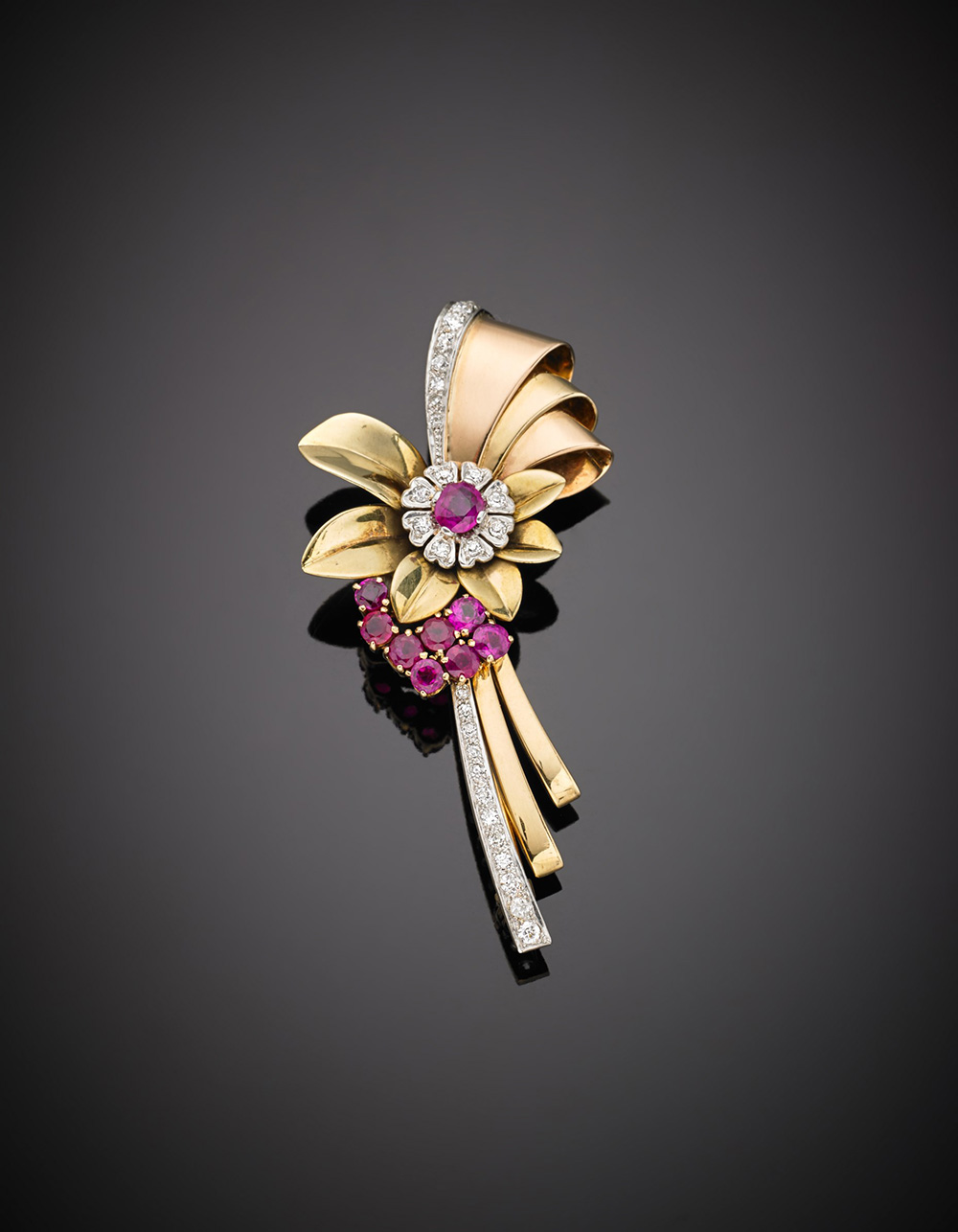 VAN CLEEF & ARPELS Broche in oro giallo, rosso e platino con diamanti e rubini, g. 20,30, lungh. cm 7. Punzonato 02-30P VAN CLEEF & ARPELS Platinum, red and yellow gold, diamond and ruby flower brooch, g. 20,30, length cm 7. Marked 02-30P