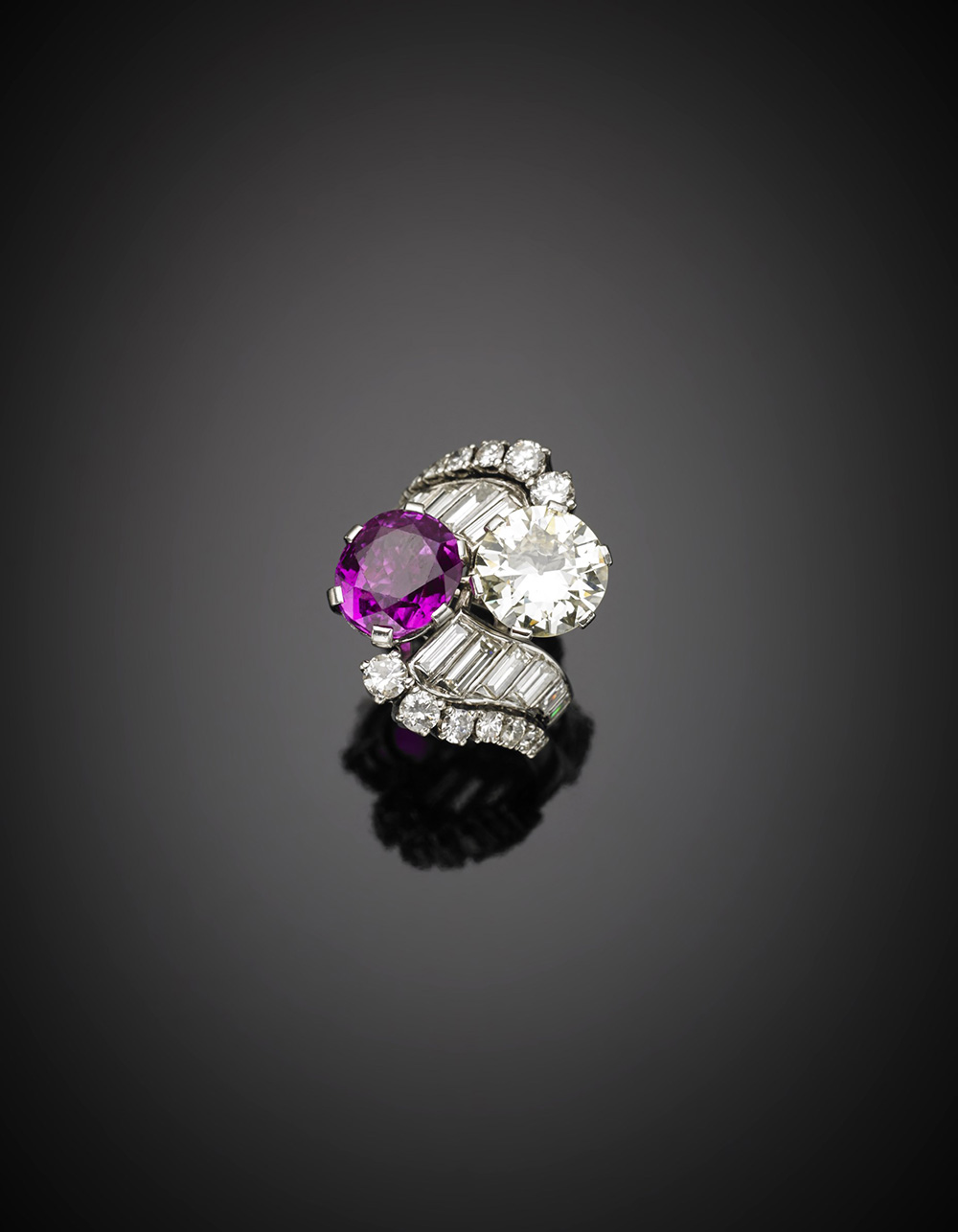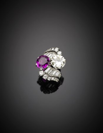 Anello contrarié in oro bianco con diamante rotondo taglio a brillante vecchio europeo di ct. 3,75, e zaffiro rosa ovale taglio composito di ct. 7,50 circa, rifinito con altri diamanti rotondi e a baguette, g. 17,10, misura 15/55 Accompagnato da Certificati Gemmologici CISGEM n. 5892 del 03/04/2017 e n. 5935IAAB del 29/03/2017 White gold round old european cut diamond ct.3,75 an oval pink sapphire ct. 7,50 circa crossover ring with round and baguette diamonds on the stem, g.17,10 size 15/55 Appended CISGEM Reports