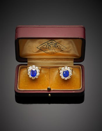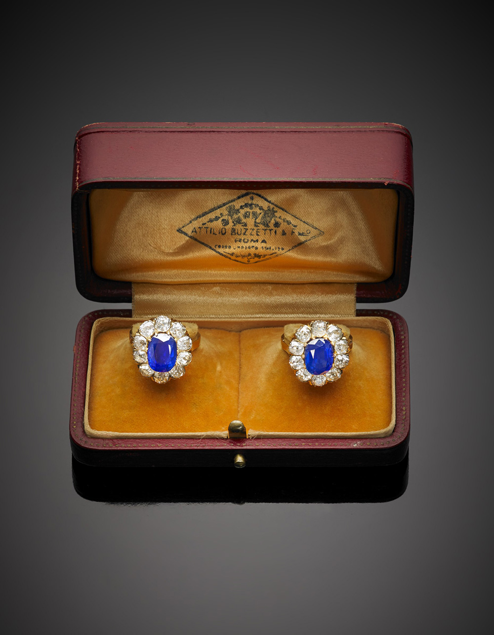 Due anelli gemelli in oro con diamanti a contornare due zaffiri ovali taglio composito non trattati di provenienza Kashmir rispettivamente di ct. 4,19 e 3,28, complessivi e diamanti per complessivi ct.5 circag.11,90 misura 11/51. In scatola originale originale Attilio Buzzetti Roma Accompaganto da certificato gemmologico CISGEM n. 5890 Milano del 03/04/2017 Two yellow gold diamond cluster twin rings with two central oval mixed cut no-heat Kashmir sapphires respectively ct.4,19 and ct.3,28, diamond in all ct.5 circa, g.11,90 size 11/51. In original Attilio Buzzetti Roma box Appended CISGEM Gemmological Report n. 5890 Milano 03/04/2017