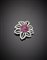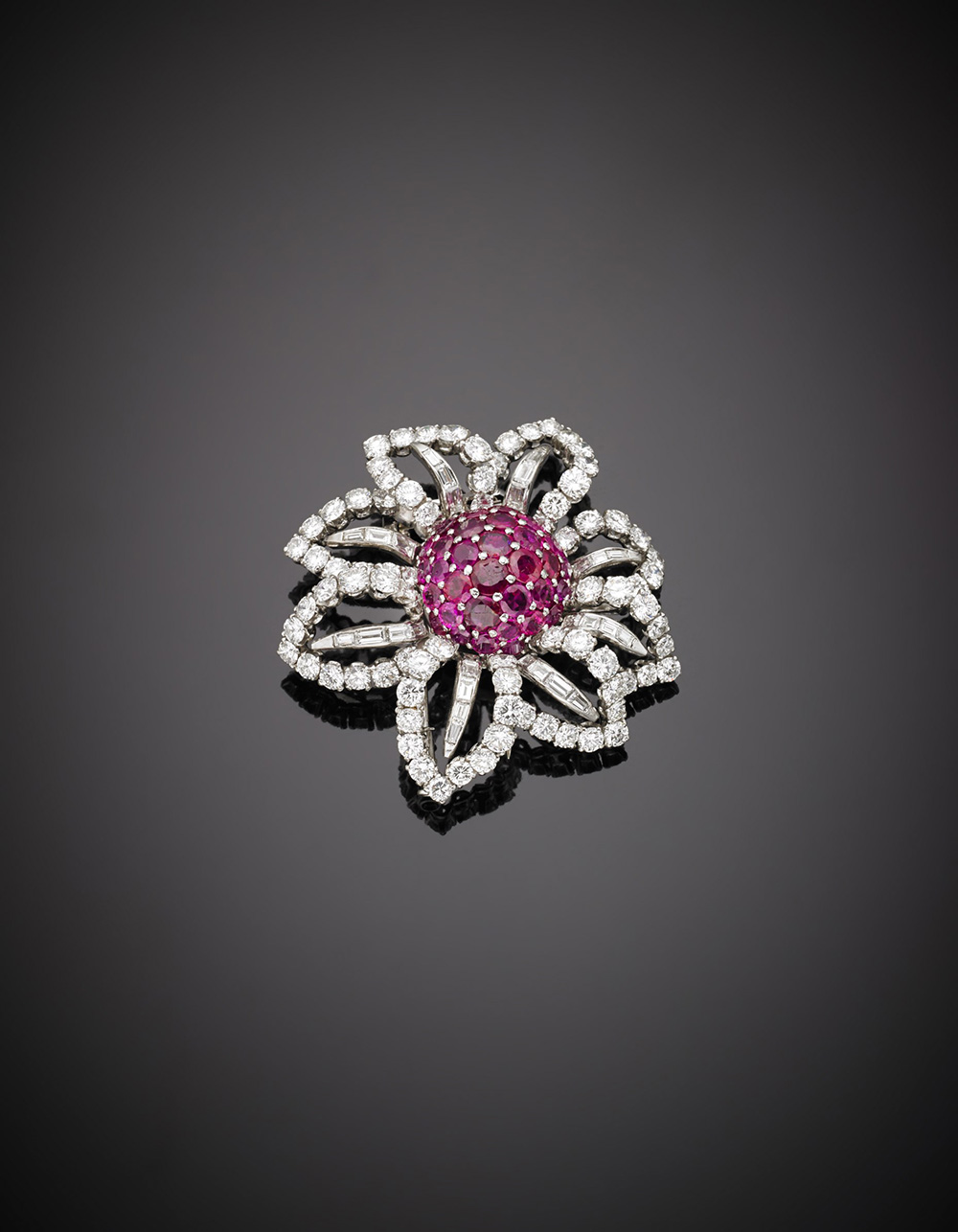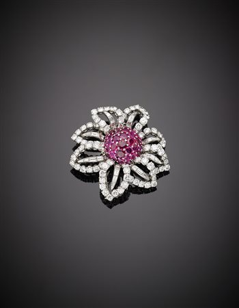 Spilla in oro bianco a guisa di fiore con diamanti rotondi e baguette per complessivi ct.11 circa a contornare una mezza boules di rubini rotondi e ovali, g. 35, largh. cm 5 circa White gold round and baguette diamond, central oval and round ruby half dome flower brooch, diamond in all ct.11 circa, g.35 width cm 5 circa