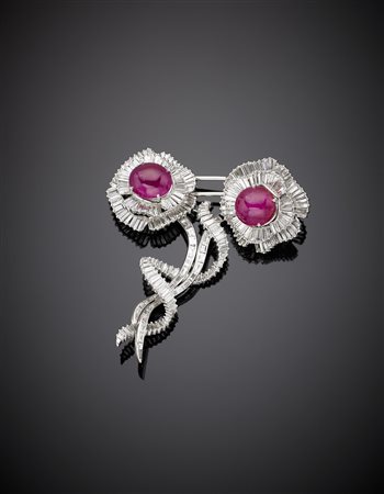 Spilla in oro bianco a guisa di fiori con nastro avvolto sugli steli con diamanti a baguette e due rubini cabochon rispettivamente di ct 8 e 11 circa e diamanti per complessivi ct.15 circa, g.35,60 lungh. cm 6,8 circa Accompagnata da analisi gemmologica CISGEM n.5824 del 21/03/2017, Milano White gold baguette diamond flower and ribbon brooch with two cabochon ruby of ct. 8 e ct 11 circa, diamond in all ct.15 circa g.35,60 length cm 6,80 circa Appended CISGEM gemmological Report Milano n.5824 21/03/2017