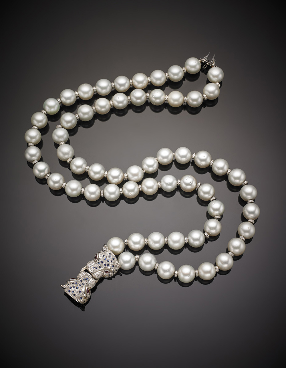 Collana a due fili di perle coltivate South-sea bianche con sfumatura grigia di mm 15,50/16, distanziate tra loro da rondelle in oro bianco e diamanti come la chiusura a due teste feline rifinite in diamanti, zaffiri e rubini, g. 398,60, lungh. primo filo interno 57 Two strand white grey-hued South-sea mm 15,50/16 cultured pearl necklace, with white gold diamond spacers and white gold diamond and gem-set leopard head clasp, g. 398,60, length inner strand cm 57 circa