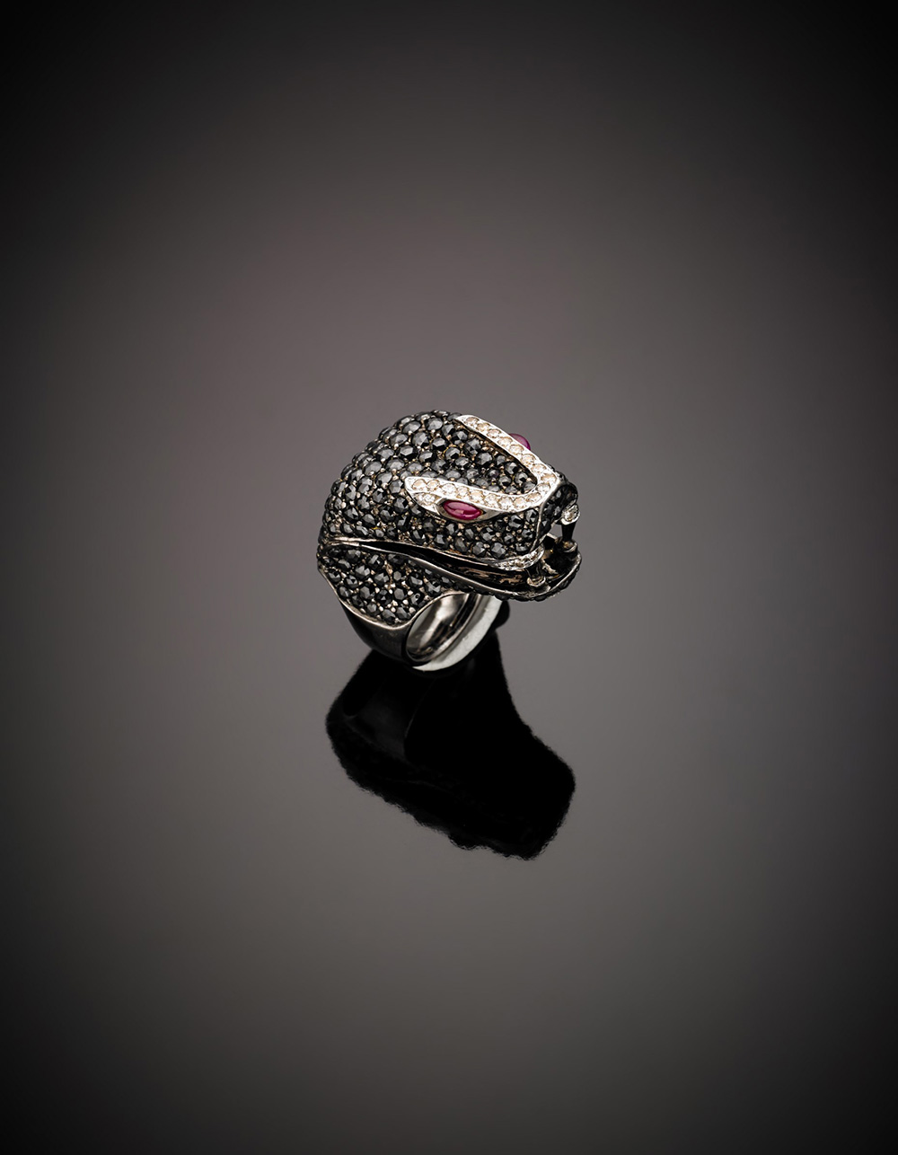 AGGRAVI Anello in oro bianco e rodiato nero a testa di serpente con diamanti neri, bianchi e due rubini cabochon a segnare gli occhi, g. 45,60, misura 16/56 AGGRAVI White and black gold, white and black diamond, ruby snake head ring, g.45,60 size 16/56