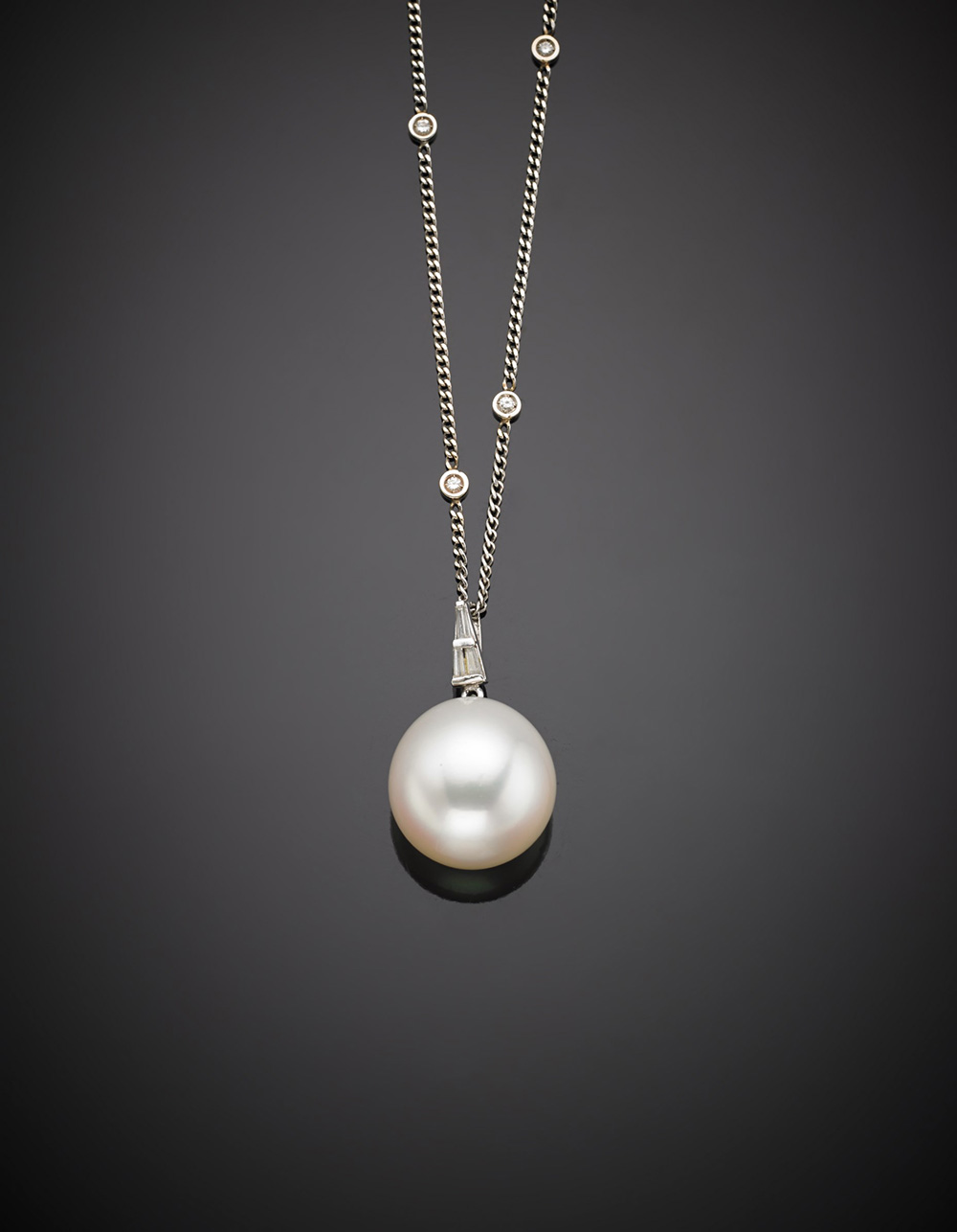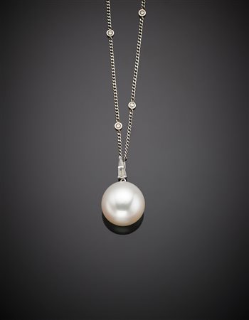 Pendente in platino e diamanti con perla bianca South-sea di mm 17x16 circa, rifinito con catena intermezzata da diamanti, g. 10,60 Platinum, diamond and a white South-sea mm 17x16 circa pearl pendant and linkchain with diamond spacers, g. 10,60