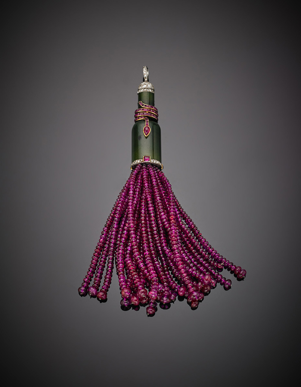 FRED LEIGHTON Pendente in platino, oro giallo e nefrite con diamanti e rubini come la nappa a terminarlo, g. 35,90, lungh. cm 11 circa FRED LEIGHTON Platinum, yellow gold, diamond and ruby nephrite pendant with ruby bead tassel, g. 35,90, length cm 11 circa