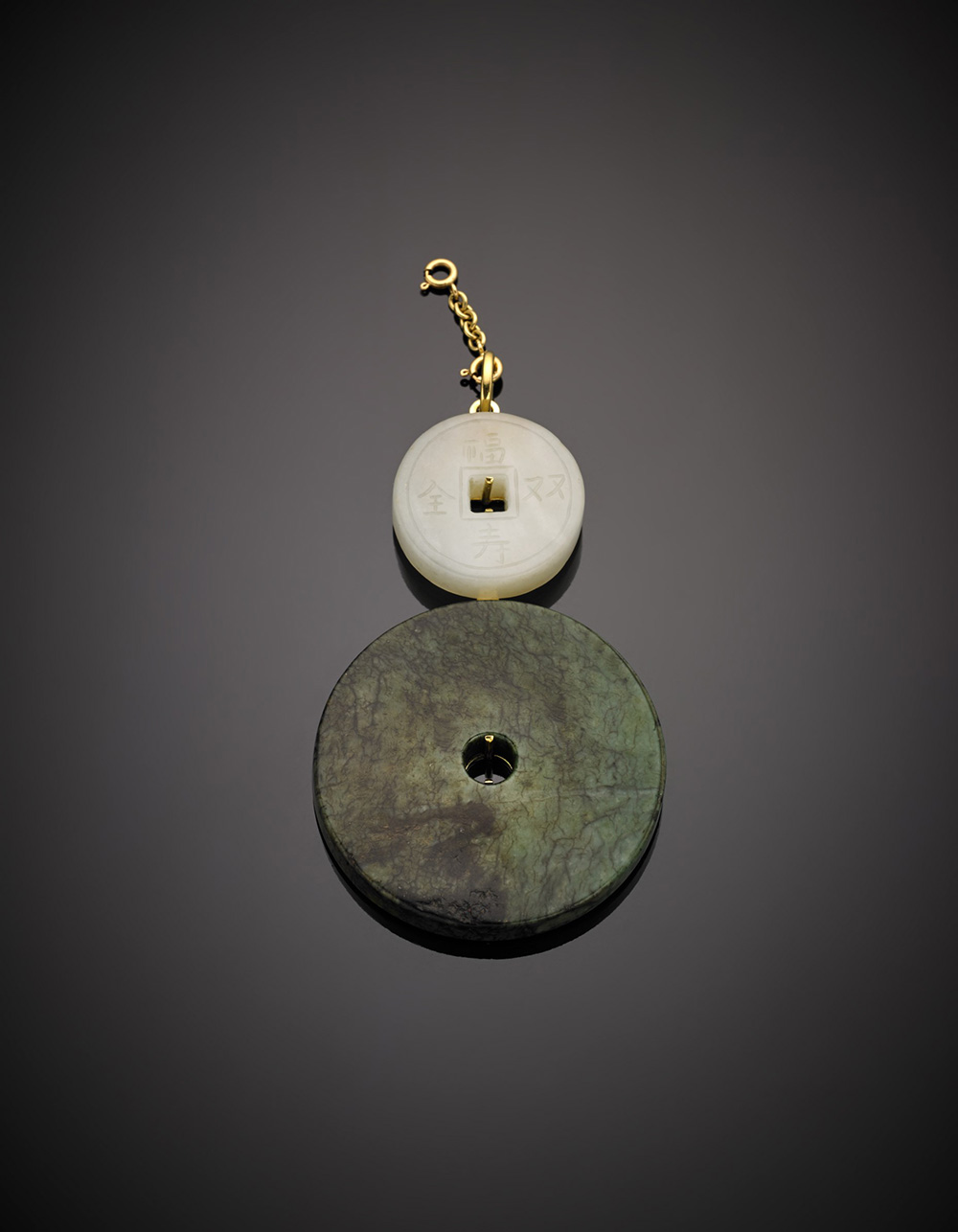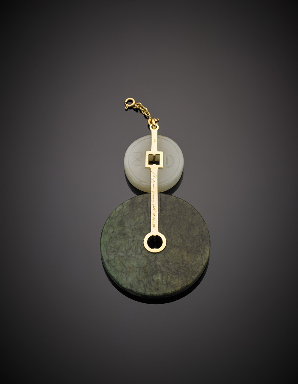 FARAONE Pendente in oro giallo con due giade rotonde forate al centro, una incisa con ideogrammi orientali, g. 51,90, lungh. cm 9 FARAONE Yellow gold round pierced disk jade pendant, one with ideogram inscription, g.51,90 length cm 9