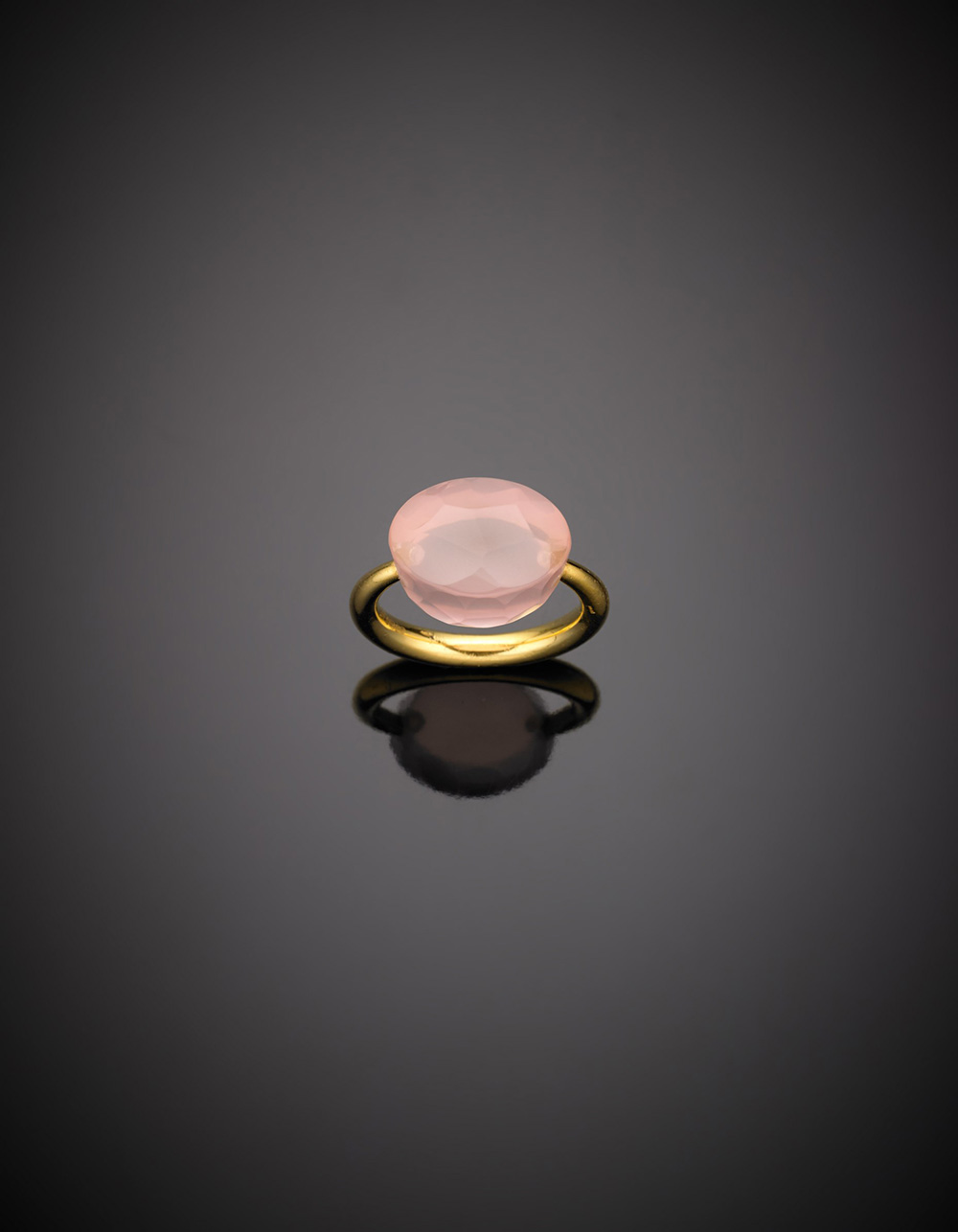 Anello in oro giallo 916/1000 a filo tondo con quarzo rosa, g. 12,80, misura 10/50. Punzonato MK Yellow 22K gold pink quartz ring, g. 12,80, size 10/50. Marked MK