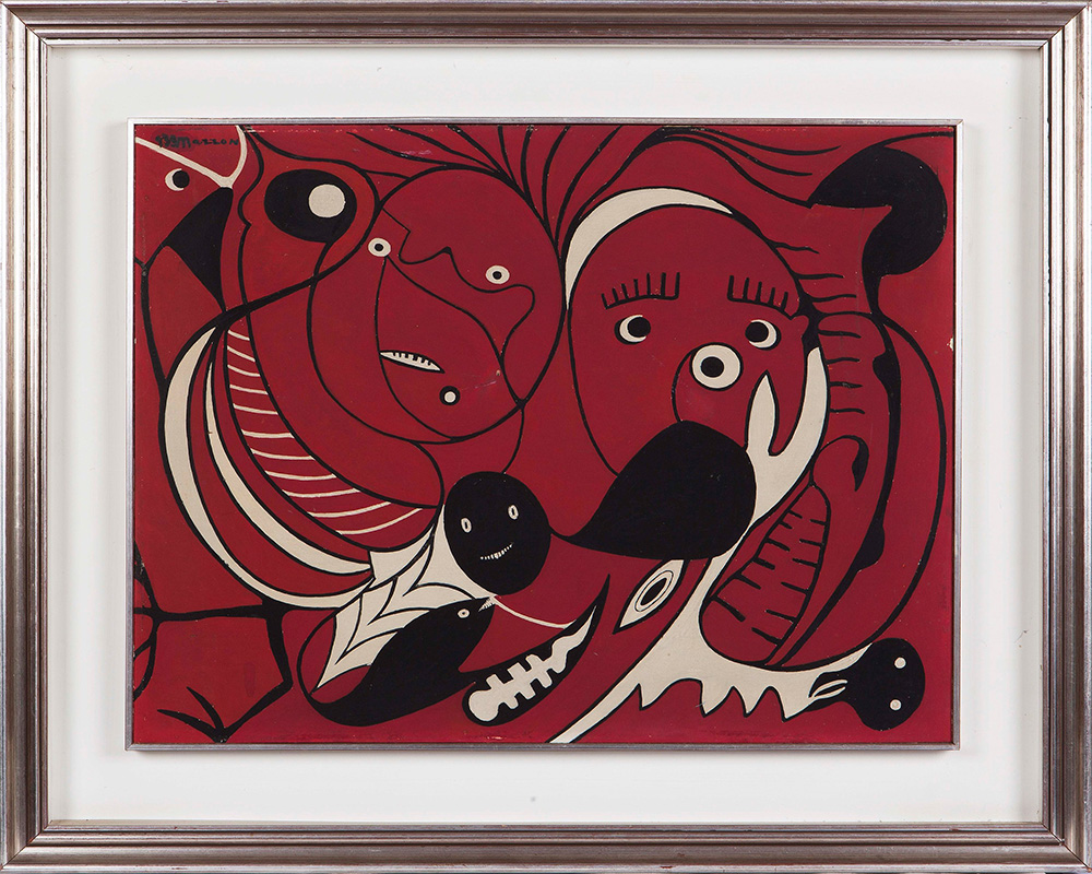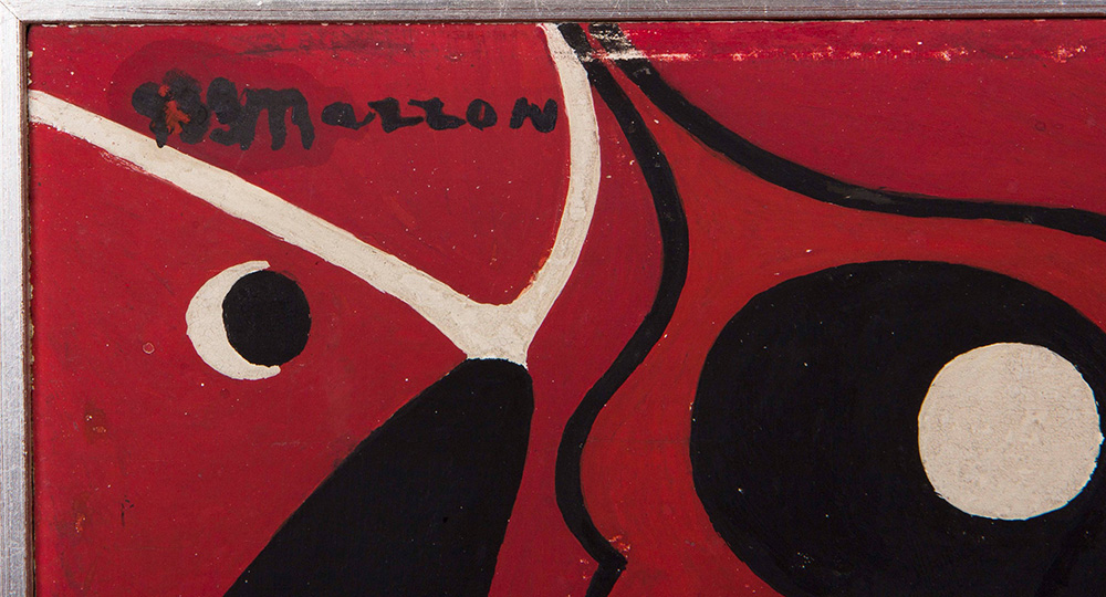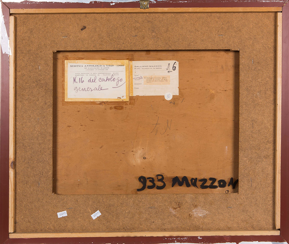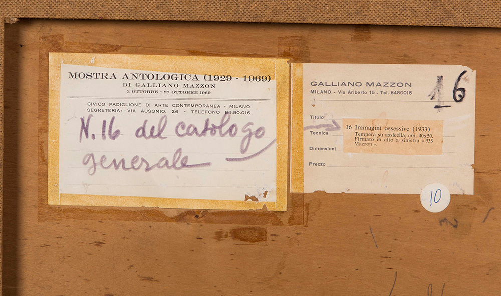 Galliano Mazzon (1896-1978), Immagini ossessive, 1933 tempera su assicella, cm 40x50 firmato e datato in alto a sinistra firmato e datato al retro Autentica su fotografia a cura di Antonio Moioli, Esposizioni: Galliano Mazzon: Mostra Antologica, Padiglione Arte Contemporanea, Milano, 1969 Bibliografia: Catalogo della mostra, opera pubblicata al n. 16