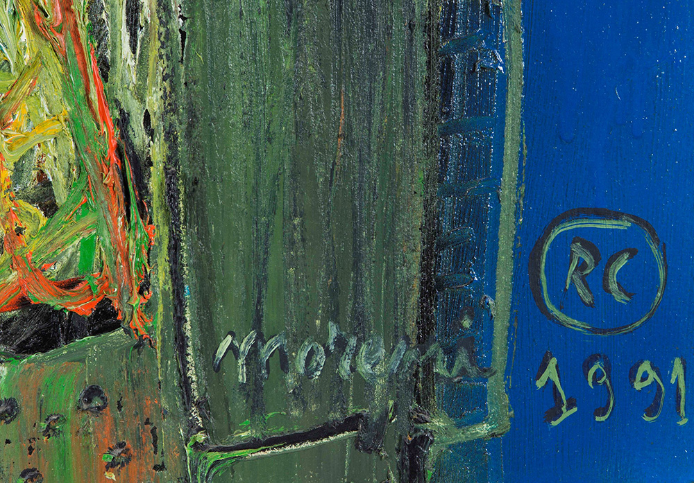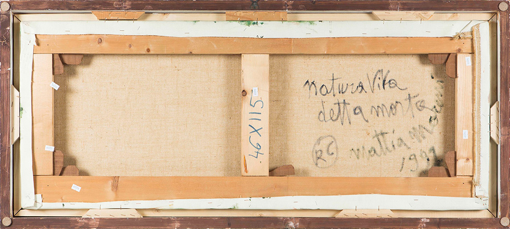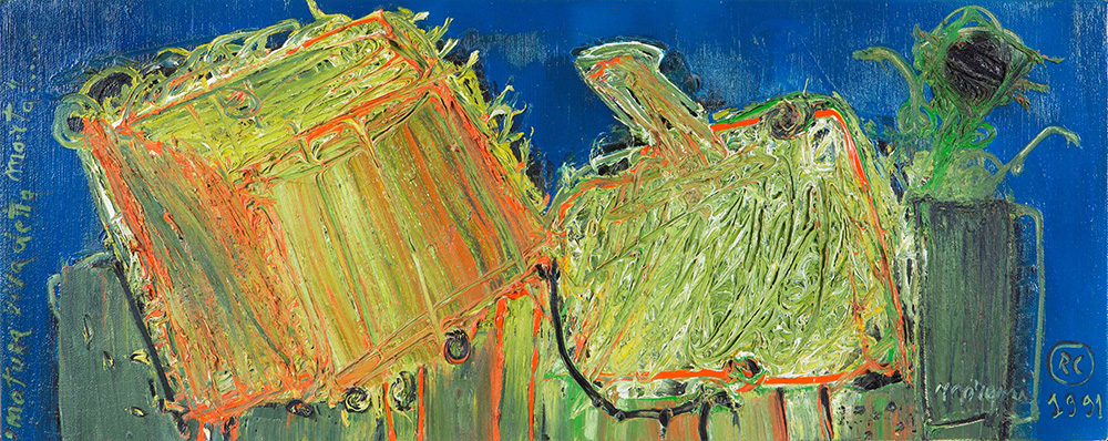 Mattia Moreni (1920-1999), Natura viva detta morta, 1991 olio su tela, cm 46x115 firmato e datato in basso a destra firmato, datato e intitolato a retro