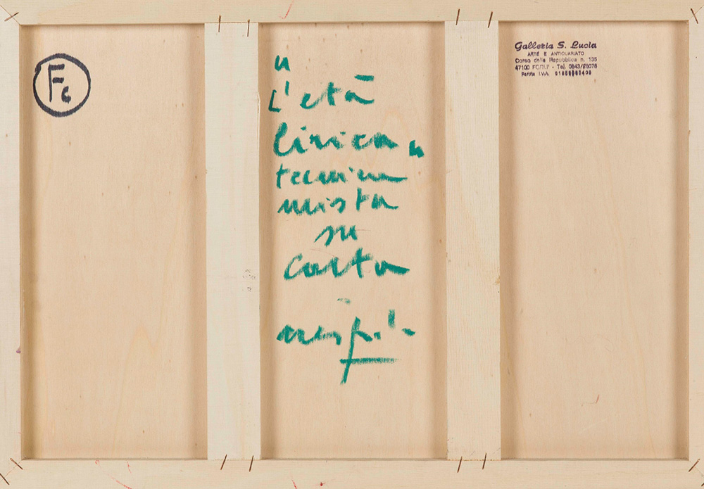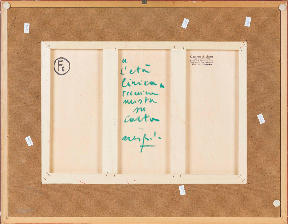 Ugo Nespolo (1941), L’età lirica tecnica mista su carta applicata su tavola, cm 35x50 firmato in basso a sinistra intitolato e firmato al retro Timbro al retro della Galleria Santa Lucia, Forlì