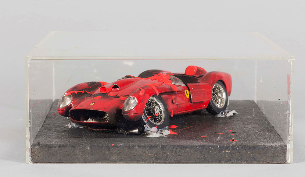 Bernard Aubertin (1934-2015), Incendia la macchina, 1990 tecnica mista su modellino di macchina montato su legno, entro teca in plexiglass, cm 10x30x25,5 firmato, datato, intitolato e dedicato sotto la base L’autenticità dell’opera è stata confermata via email da Giancarlo Rovetta dell’Archivio Aubertin in data 14 febbraio 2017