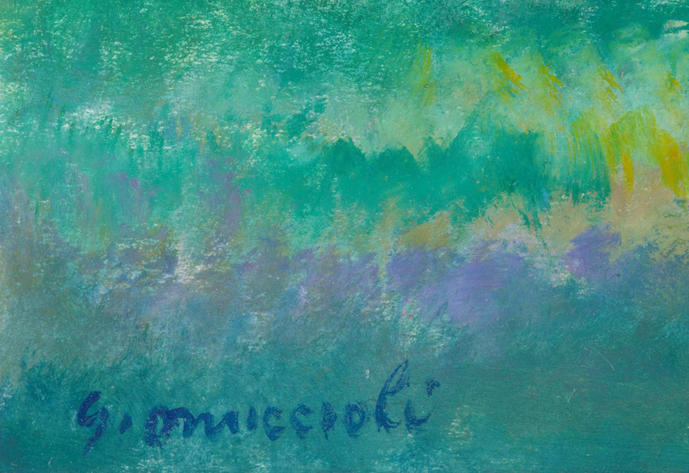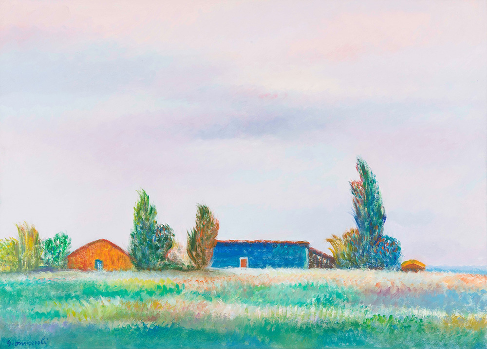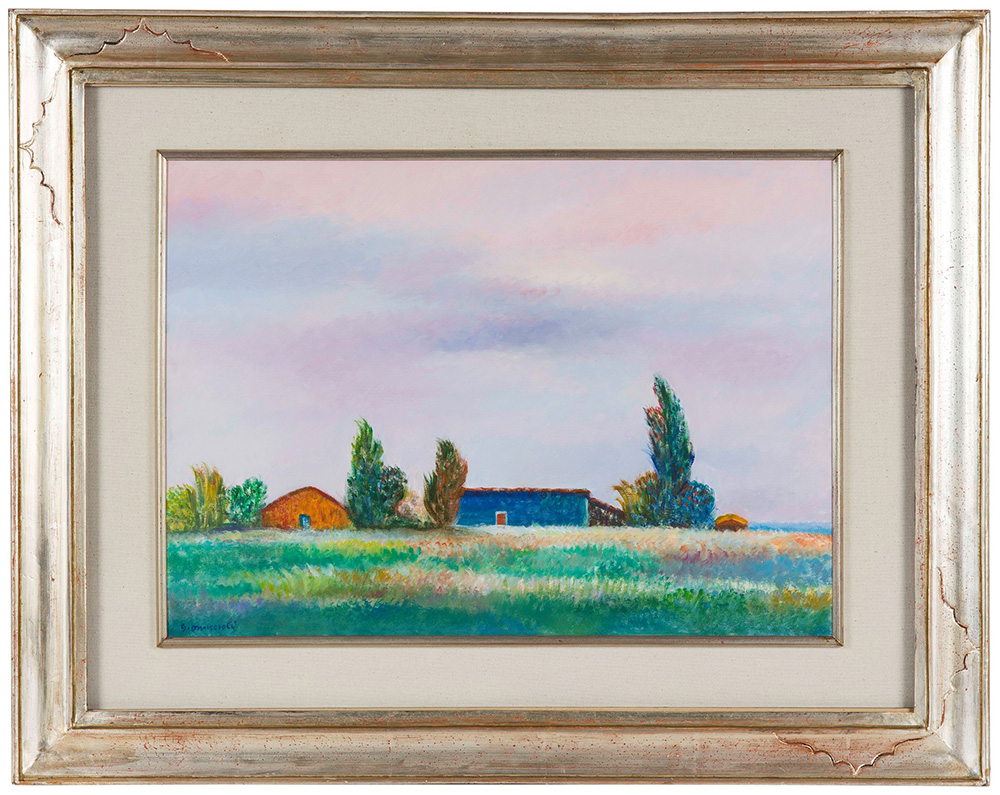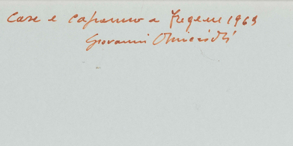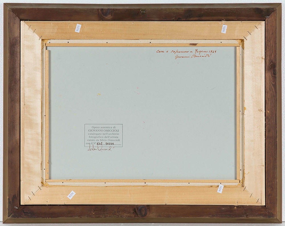 Giovanni Omiccioli (1907-1975), Case e capanne a Fregene, 1969 acquerello e pastello su cartone, cm 36x50 firmato in basso a sinistra firmato, datato e intitolato al retro Opera registrata nell’archivio fotografico dell’artista con il n. 642 90205
