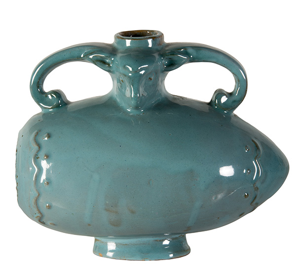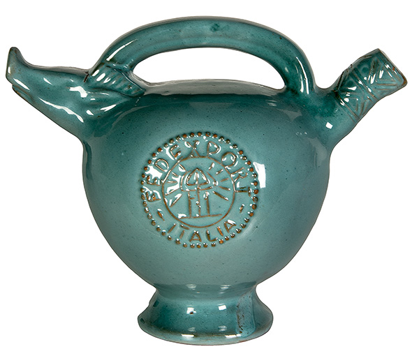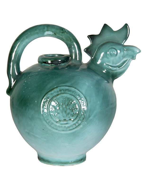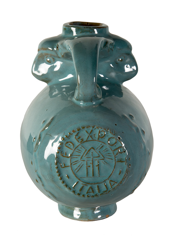 MELKIORRE MELIS, Tre vasi decorati con elementi zoomorfi, 1955, Ceramica smaltata verde, h.. 22 cm; 17 cm; 17,5 cm, Iniziali sotto la base: MM Marchio in rilievo nella fascia: FEDEXPORT ITALIA Un esemplare analogo è pubblicato in Ceramica di sardegna, a cura di M. Marini e M. L. Ferru, Ed. Tema, p. 111, n. 66