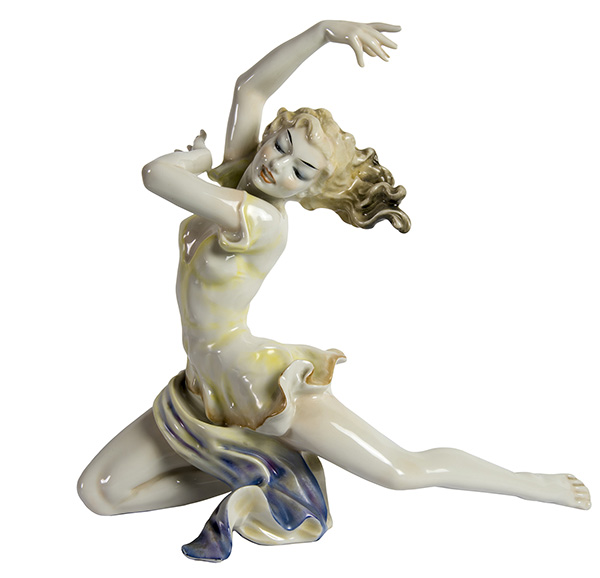 K. TUTTER (1883 - 1969), Danzatrice, Anni ‘30-’35 circa, Scultura in ceramica dipinta, 29 x 30 x 15 cm, Firma incisa sotto la base: K. Tutter Marchio sotto la base: Hutschenreuther Selb, Germany