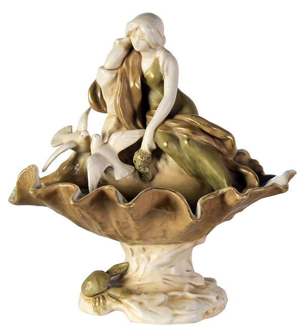 ROYAL DUX - BOHEMIA, Figura di donna distesa dentro conchiglia, Scultura in ceramica dipinta, 27 x 27,5 x 17 cm, Marchio in rilievo sotto la base: ROYAL DUX BOHEMIA Impresso sotto la base: Made in Czechoslovakia