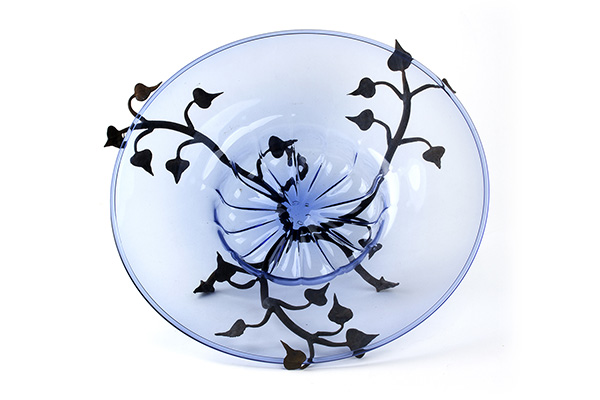 VITTORIO ZECCHIN, Grande piatto in vetro blu con supporto in ferro battuto lavorato a motivi vegetali, Anni ‘20, Cappellin - Venini, vetro e ferro battuto, 9,3 x 47,5 cm (piatto); h.14,3 cm (con il supporto), Supporto in ferro battuto realizzato su disegno di Alberto Gerardi (?)