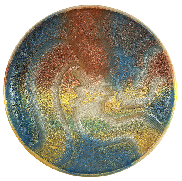 CARLO ZAULI, Piatto decorato a motivi astratti, Ceramica policroma, 6,5 x 32 cm, Firma incisa sotto la base: ZAULI