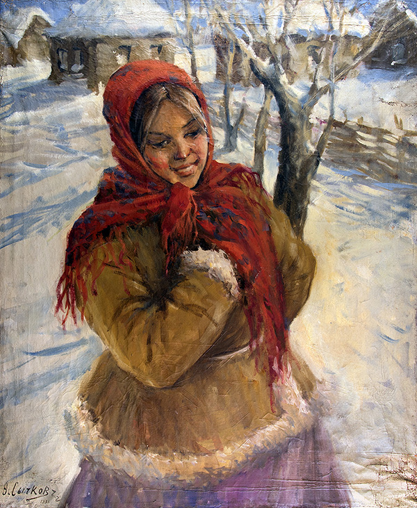 FEDOT VASILIEVICH SYCHKOV, Ragazza in un paesaggio innevato, 1931, Olio su tela, 100 x 80 cm, Firma e data in basso a sinistra